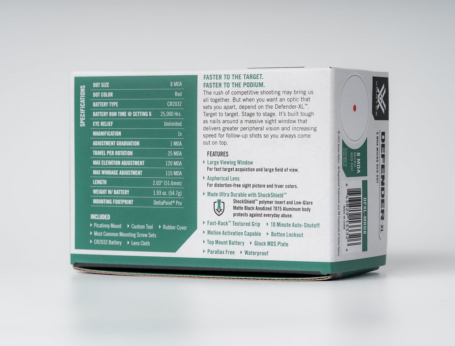 Dizajniran oko ultra-širokog prozora za nišanjenje radi brže promjene cilja, Defender-XL je izdržljiv, natjecateljski spreman micro red dot ciljnik koji također izvrsno funkcionira na službenim ili streljačkim pištoljima—kao i na karabinima/sačmaricama kada se koristi s priloženom Picatinny šinom.